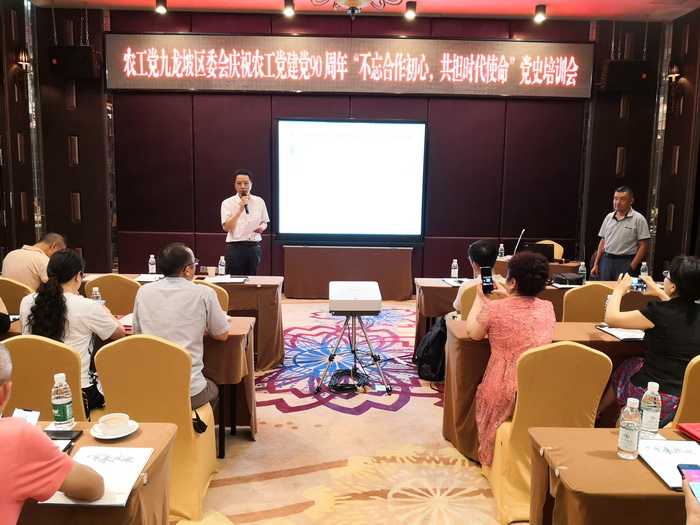 为庆祝中国农工民主党成立90周年,8月8日,农工党九龙坡区委会在贝迪颐园举办“不忘合作初心,共担时代使命”党史培训会。在培训会上,农工党江北区委会委员、重庆字水中学高中政治教师刘旺从“党”字出发,带领党员们回顾农工党90年走过的每一个脚印。一代又一代农工党人薪火相传、携手与共,积极投身中国共产党领导的革命、建设、改革和实现民族复兴伟大事业,谱写的历史篇章让党员们铭记。